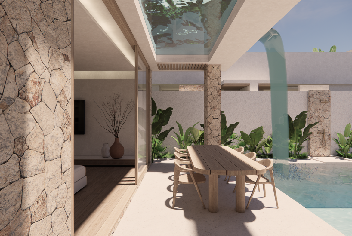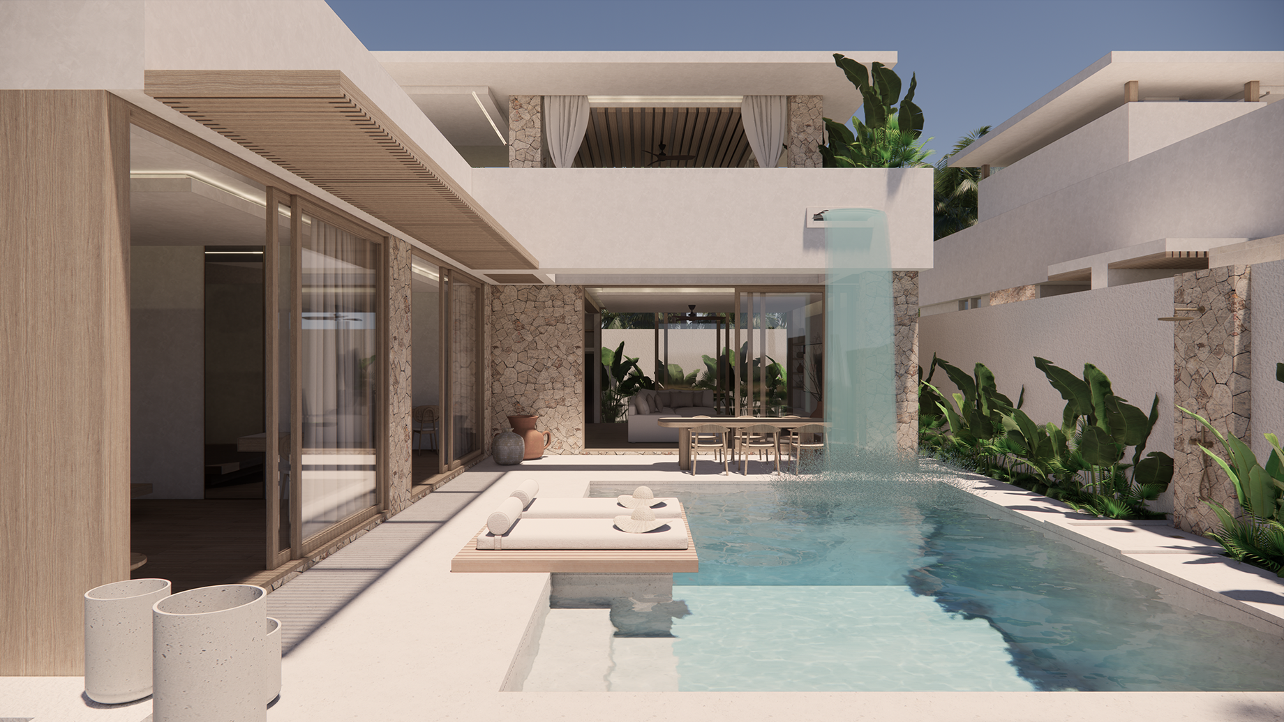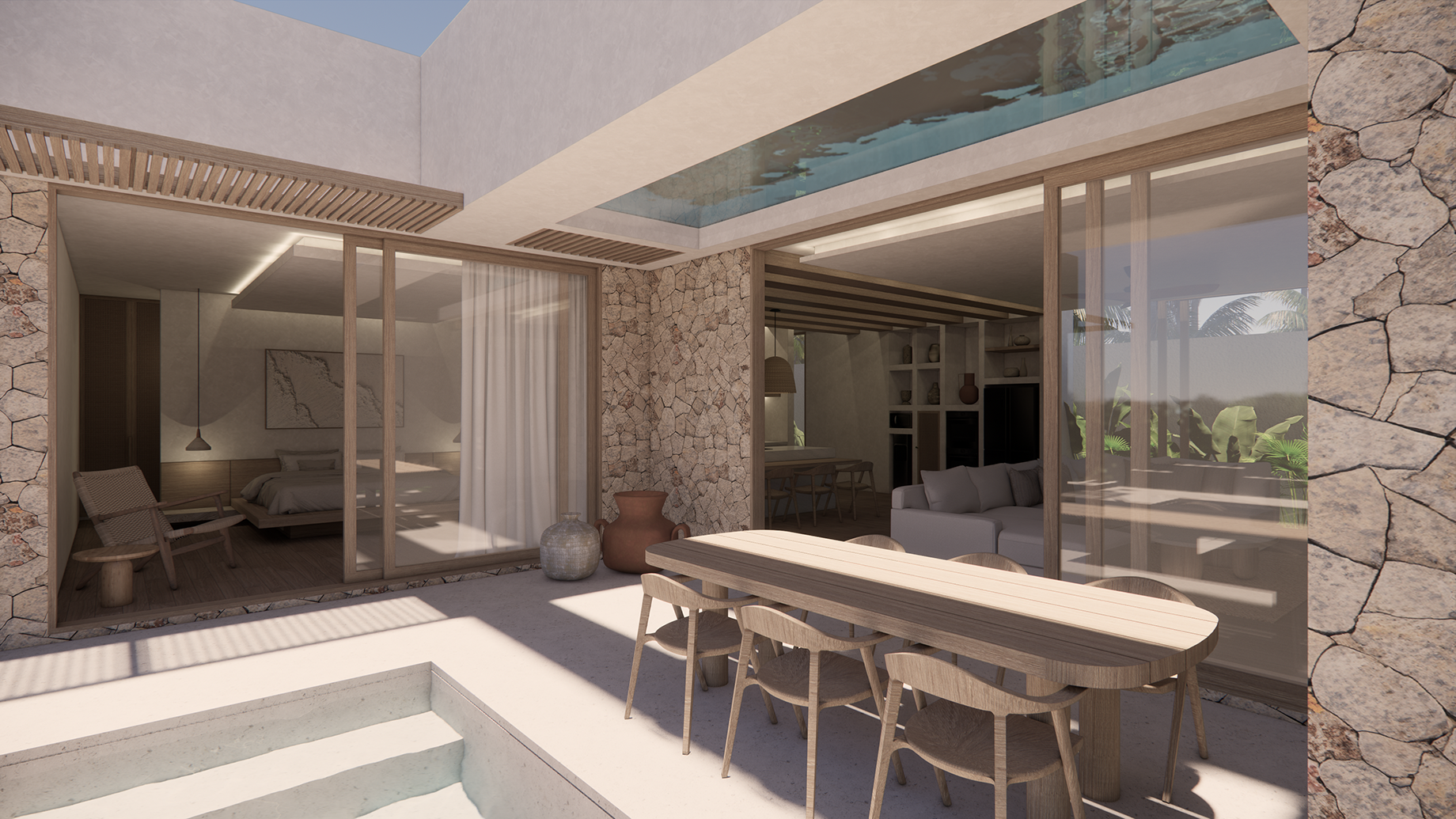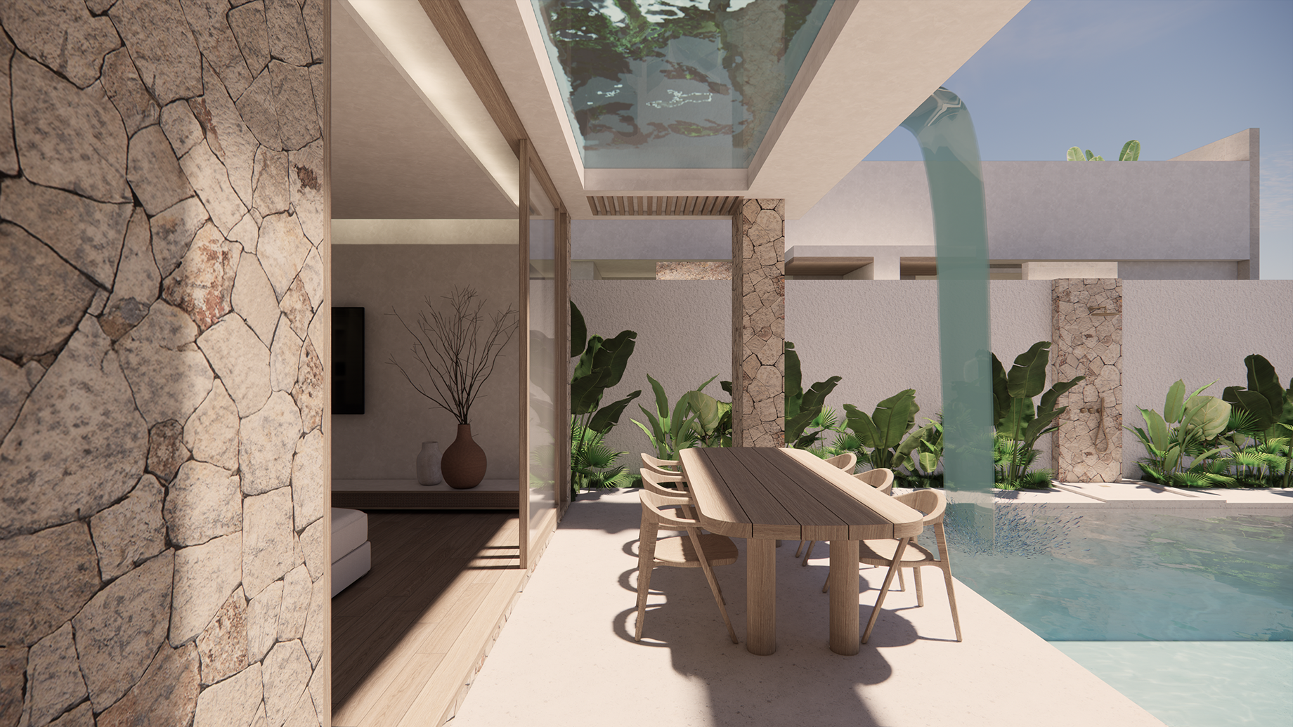 • Private double pools with mesmerizing glass bottoms and elegant waterfalls.